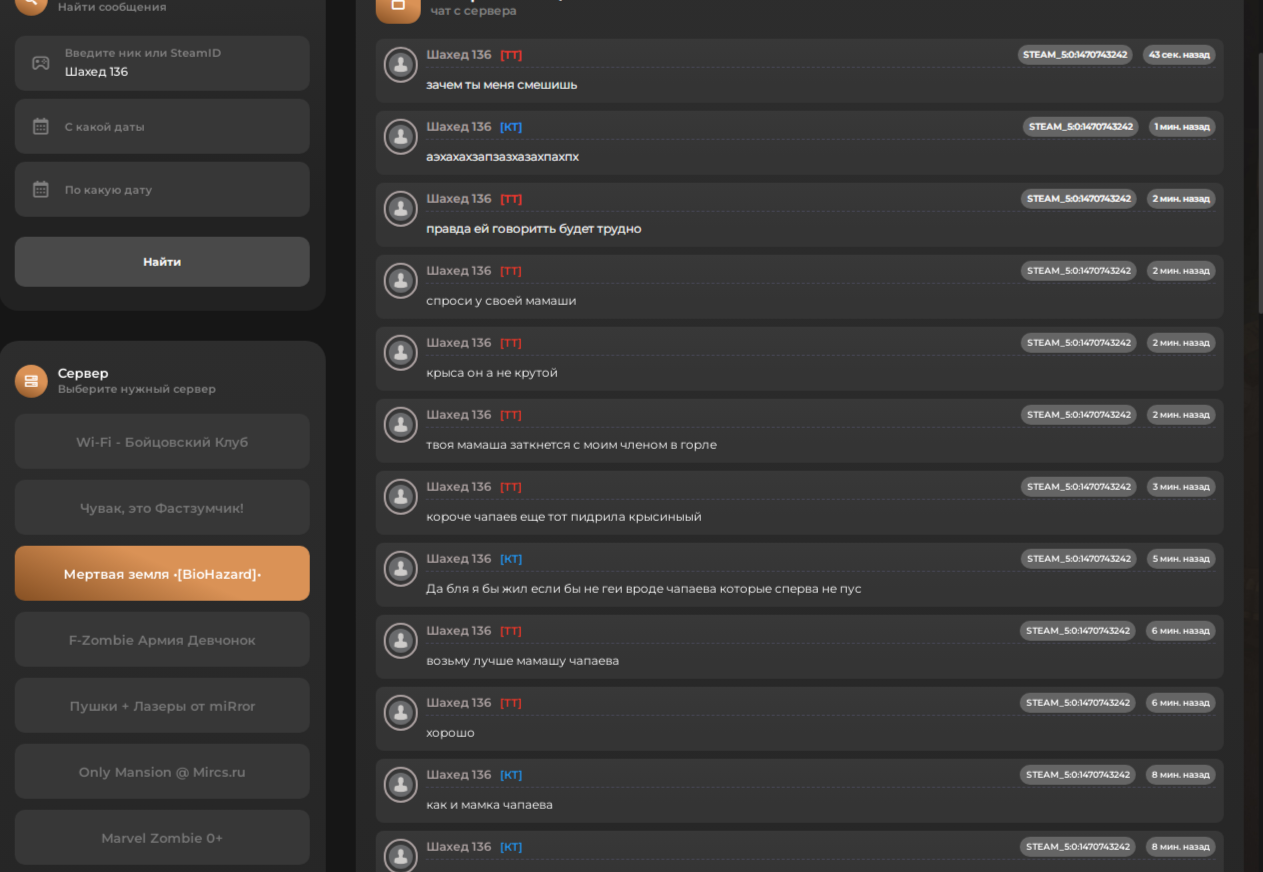 Имя пользователя: molodou228 Ник админа/игрока, на которого подается жалоба: Шахед 136 Описание проблемы: оскорбление родных Скриншот/демо: