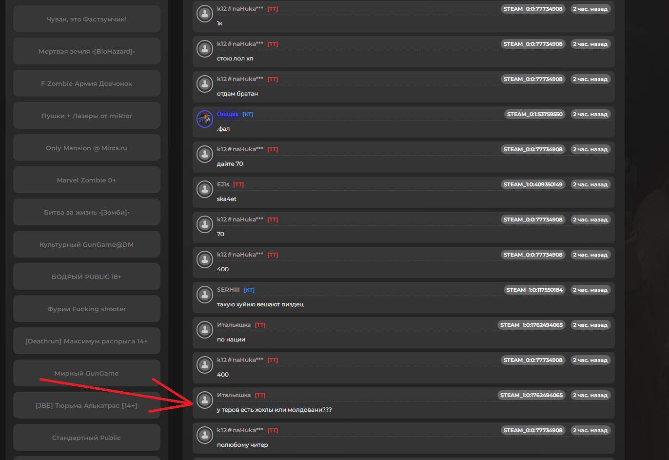 А я что кого то оскорбила или что то плохого сказала ? Если человек спросил кто по национальности, то что значит он хочет что то плохого или что ?Итальяшка STEAM_1:0:1762494065