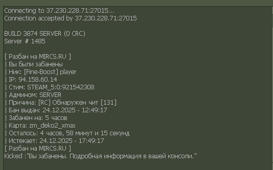 Kicked :"Вы забанены. Подробная информация в вашей консоли."