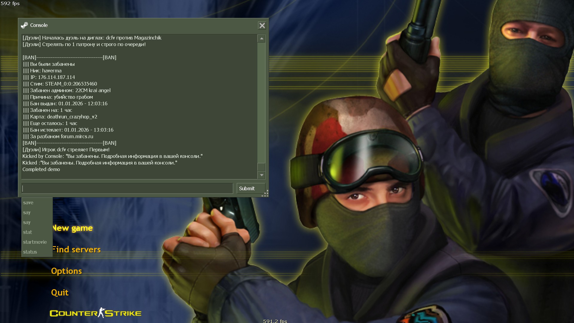 Информация из консоли: я убил типа грабом который стоял на базе и до меня начал докапываться 22CM krai angel сказал какая причина убиства я ему ответил что он стойть на базе а и он сказал что я не должен был его убивать и дал бан по причине убиство грабом