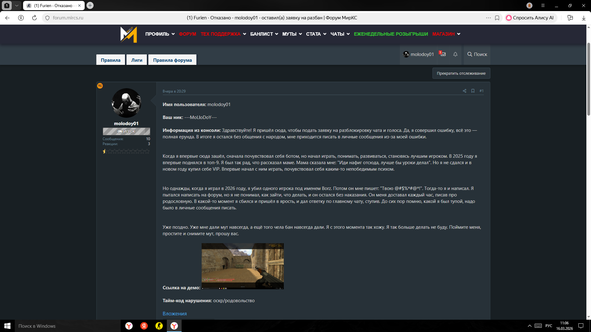 Информация из консоли: "Здравствуйте! Я обращаюсь по поводу разбана чата и голоса. Два месяца назад я подавал запрос на разбан, и тогда мне было сказано: 'Тебе срок 2 месяца, тогда и возвращайся, тогда и посмотрим'. Сегодня я вернулся, прошло уже больше двух месяцев, и я уверен, что исправился. Говорю вам правду. Простите меня за мои прошлые ошибки.